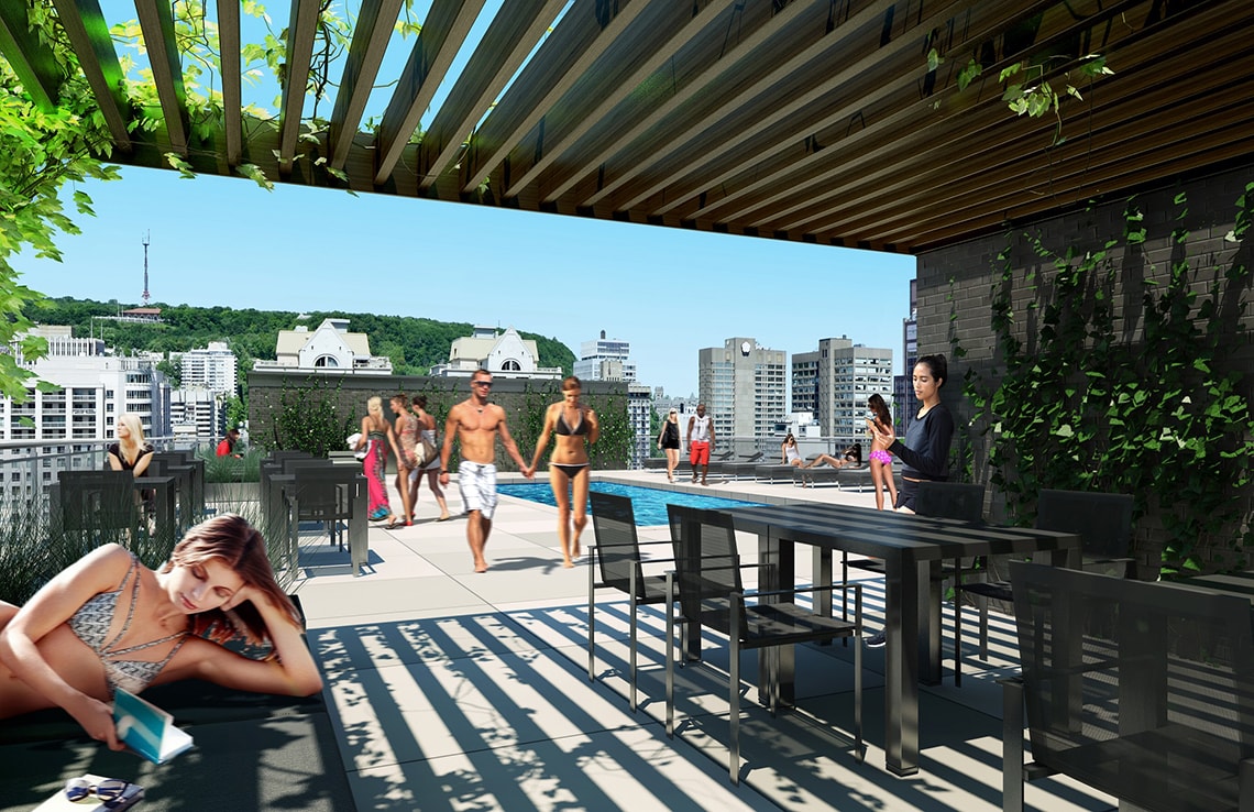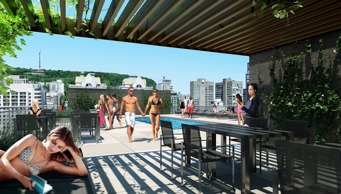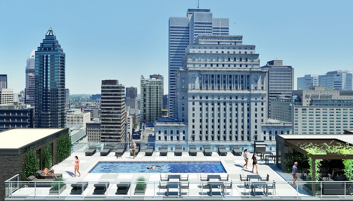 Rooftop Oasis: Includes a saline pool, lounge decks, dining and BBQ areas, and panoramic viewpoints over Mount Royal and downtown Montreal.
