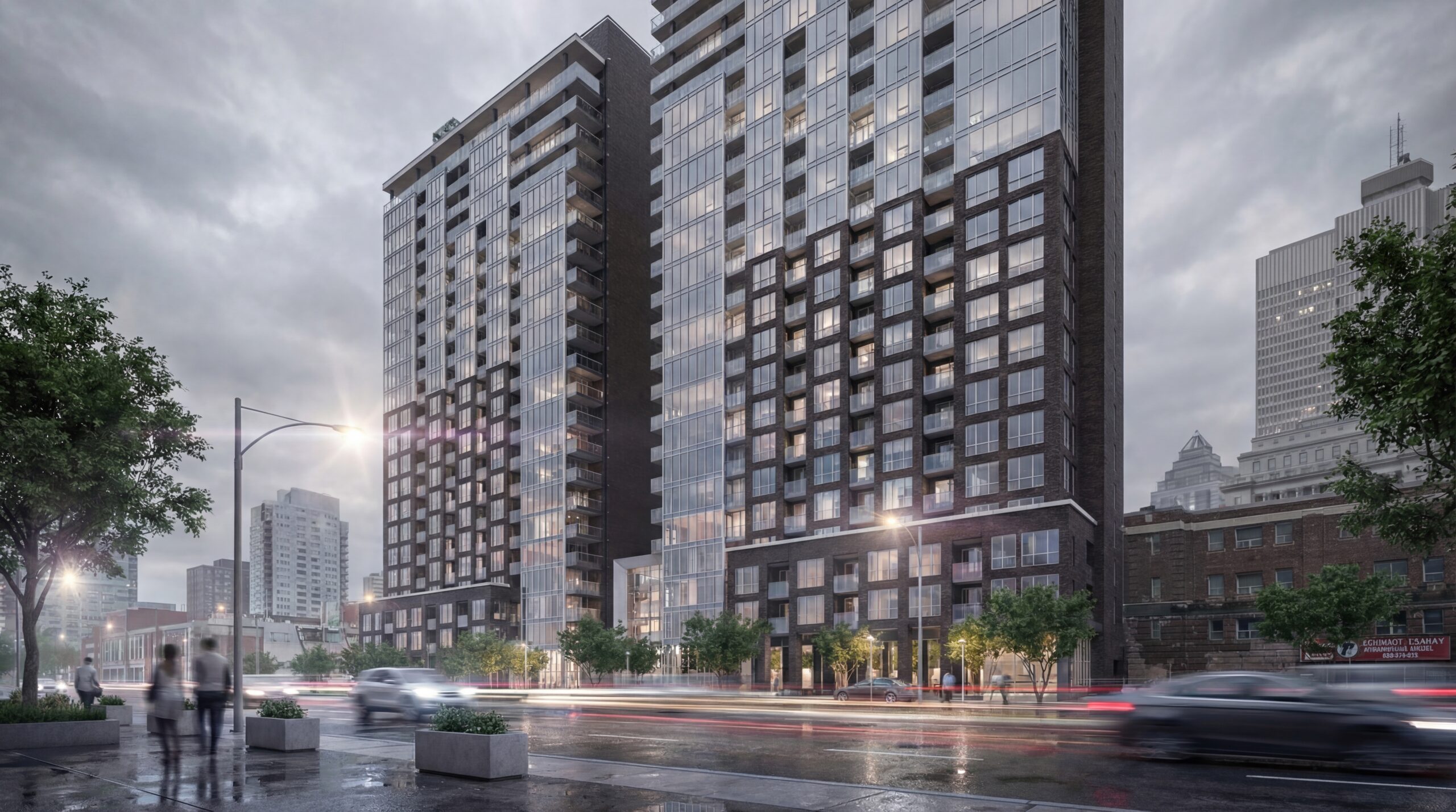 The architecture seeks to mediate between the scale of Montréal’s downtown towers and the human scale of street life. The Cube, positioned between towers, becomes a connective heart, visually and programmatically binding the two volumes while offering interior transparency, amenity access, and rooftop continuity. Facade composition emphasizes large glazing and refined materials, enabling light, views, and visual openness without compromising structure or privacy. Above, the rooftop experience is elevated literally with lounge terraces, a saline pool, panoramic views of Mount Royal and the city skyline, and curated social space.