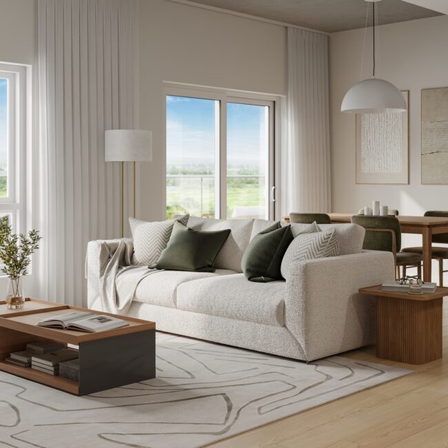 We viewed Le Milebrook as a sustainable urban village walkable, community-driven, and built with architectural coherence. Despite the scale of the site, the buildings are broken into repetitive volumes with modulated façades, giving them an approachable, almost residential grain. Key to the architectural language is the use of horizontal breaks and stepped massing, while emphasizing the relationship between the buildings and their landscaped surroundings.